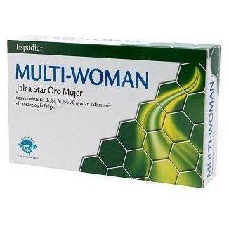 Jalea Multi-Woman de Espadiet es un complemento alimenticio específico para mujeres que aporta todos los nutrientes esenciales, ayudando a tener unos niveles altos de energía física y mental. Cubriendo también las necesidades hormonales, aportando vitaminas y minerales necesarios.